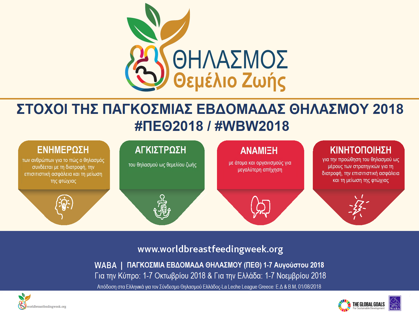 Η Παγκόσμια Συμμαχία Δράσης για τον Μητρικό Θηλασμό (WABA) προβαίνει κάθε χρόνο σε μία σειρά προωθητικών δράσεων με σκοπό την ευαισθητοποίηση της κοινής γνώμης για την αξία του θηλασμού. Το σύνθημα της Παγκόσμιας Εβδομάδας Θηλασμού (WBW/ΠΕΘ) για το 2018 είναι «Θηλασμός: Θεμέλιο Ζωής» και συνδέεται με το γεγονός ότι σε έναν κόσμο γεμάτο ανισότητα, κρίσεις και φτώχια, ο θηλασμός είναι το θεμέλιο για μια διά βίου καλή υγεία για τις μητέρες και τα μωρά τους.