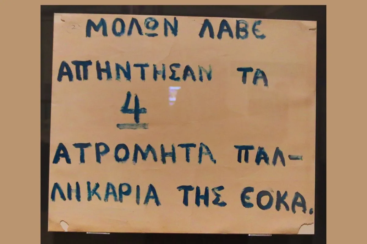 Η έκθεση παρουσίασε, στους 6 μήνες της διάρκειάς της, εκθέματα από τον αγώνα της ΕΟΚΑ – για να σταθούμε στην περίπτωση της Κύπρου – με αναφορές που ομολογούσαν τα καταπιεστικά μέτρα που επέβαλαν στην πατρίδα μας: Τους κατ’ οίκον περιορισμούς, τις συλλήψεις και τα κρατητήρια, τη φρίκη των βασανιστηρίων και την εύκολη καταδίκη σε θάνατο.