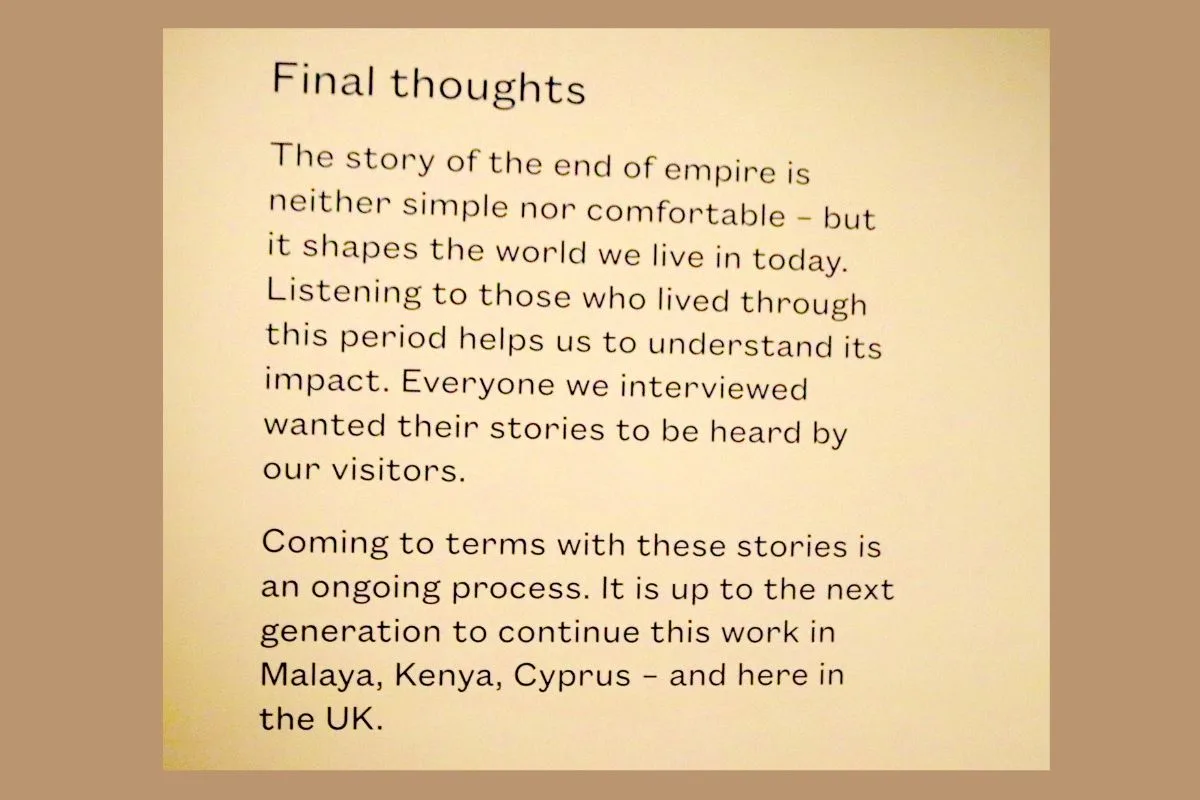 Μέσα από τα εκθέματά τους οι Βρετανοί παραδέχονται ότι ενθάρρυναν τις εντάσεις μεταξύ Ελληνοκυπρίων και Τουρκοκυπρίων, βαθαίνοντας τον κοινοτικό διαχωρισμό ανάμεσα στην πλειοψηφία και μειοψηφία, κάνουν μια απλή αναφορά για τους εννέα απαγχονισθέντες και φιλοξενούν συνεντεύξεις ζώντων αγωνιστών της ΕΟΚΑ. Προβάλλουν ακόμα απόσπασμα δηλώσεων του Υπουργού Αποικιών το 1954 που παραδέχεται πως «…υπάρχουν ορισμένες περιοχές στην Κοινοπολιτεία που λόγω των ιδιαίτερων περιστάσεων, ποτέ δεν μπορούν να περιμένουν να γίνουν πλήρως ανεξάρτητες».