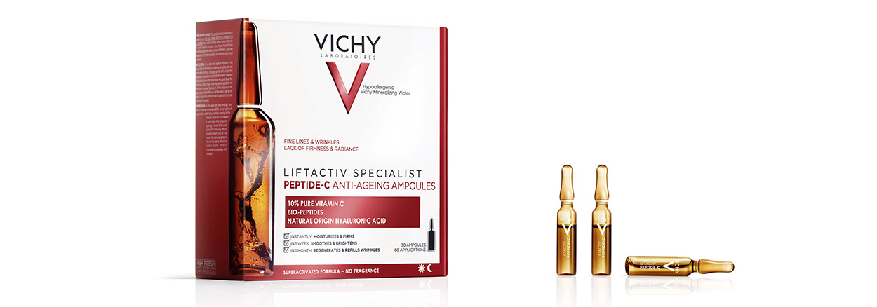 Αυτές οι αμπούλες είναι ότι χρειάζεσαι για να καταπολεμήσεις τις επιπτώσεις της απώλειας κολλαγόνου στην επιδερμίδα σου. Ο συνδυασμός από τα ισχυρότερα αντιγηραντικά, δερματολογικά δραστικά natural συστατικά (10% καθαρή βιταμίνη C, αντιγηραντικά βιο-πεπτίδια, φυσικής προέλευσης υαλουρονικό οξύ πολλαπλού μοριακού βάρους) βοηθούν στην αναπλήρωση του όγκου και γέμισμα των ρυτίδων και Ιαματικό Μεταλλικό Νερό της Vichy για ενδυνάμωση. Θα χρησιμοποιείς μια αμπούλα κάθε πρωί και βράδυ και θα δεις την επιδερμίδα σου να ενυδατώνεται και να γίνεται πιο σφριγηλή. Σε 10 ημέρες, θα ανακτήσει τη λάμψη της, θα γίνει πιο λεία και πιο φωτεινή. Σε 30 ημέρες, οι ρυτίδες γεμίζουν και η επιδερμίδα αναζωογονείται.