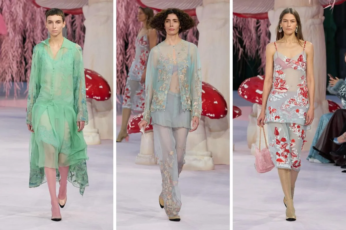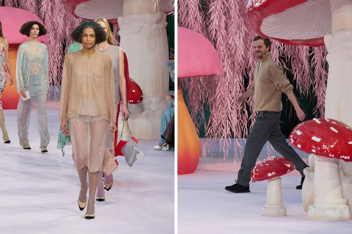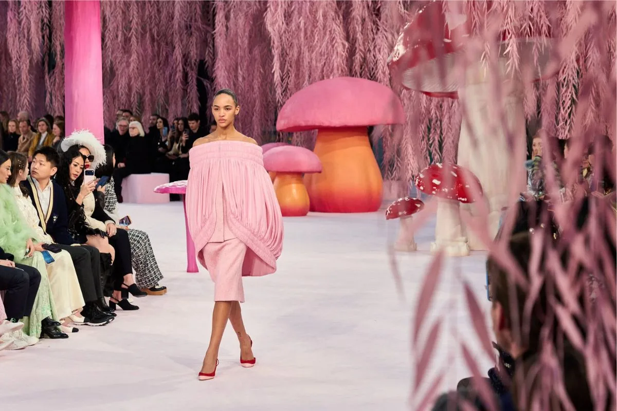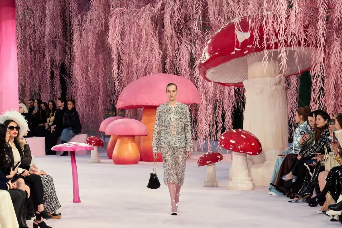 Η μεταμόρφωση του Grand Palais σε έναν μαγικό κήπο με τεράστια μανιτάρια, ροζ ιτιές και φυλλωσιές δημιουργεί ένα περιβάλλον που μοιάζει να ξεπήδησε από παραμύθι – μια σκηνογραφία που ενώνει τη φύση με τη φαντασία και μας μεταφέρει σε μια άλλη διάσταση μόδας και τέχνης.