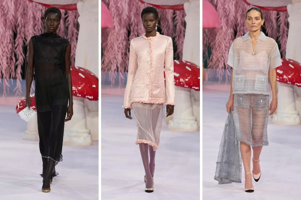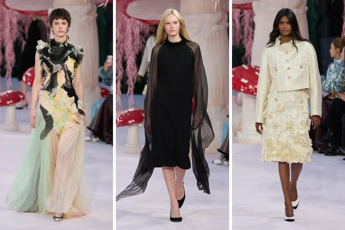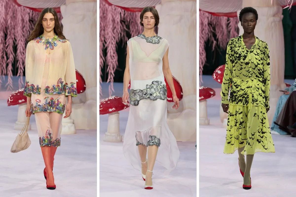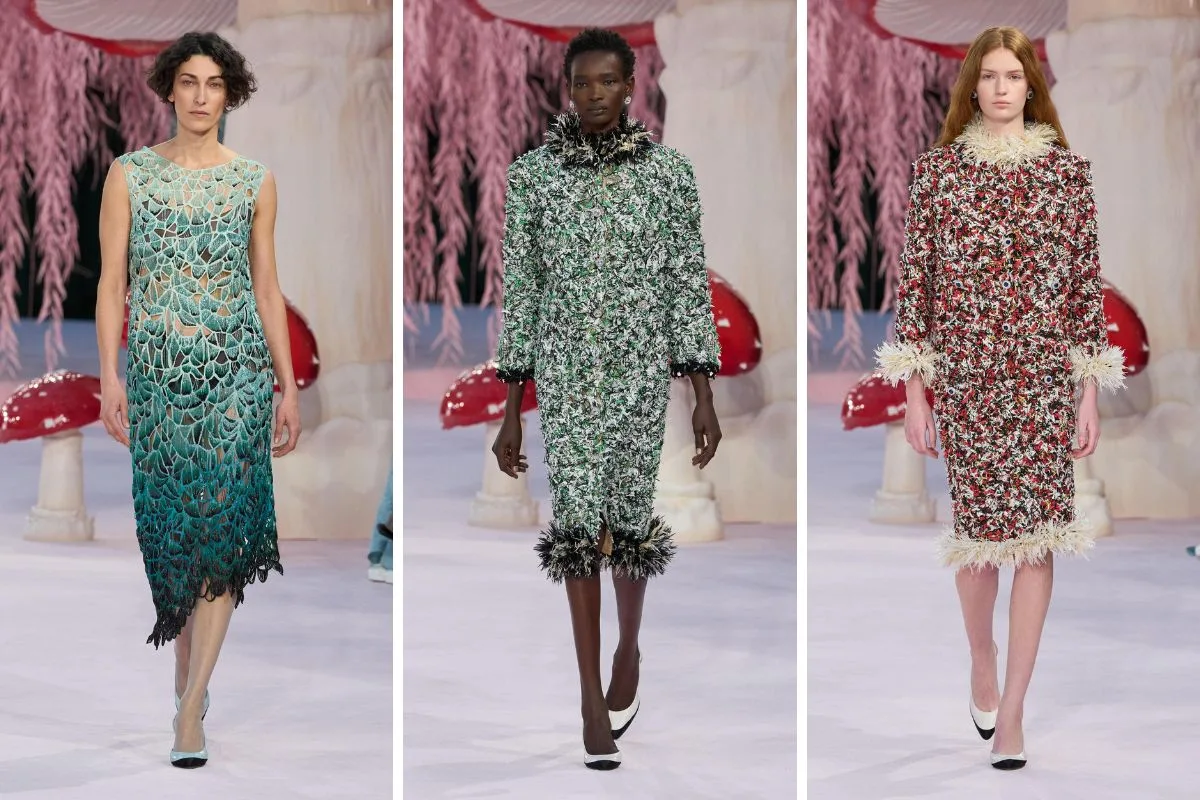 Η μεταμόρφωση του Grand Palais σε έναν μαγικό κήπο με τεράστια μανιτάρια, ροζ ιτιές και φυλλωσιές δημιουργεί ένα περιβάλλον που μοιάζει να ξεπήδησε από παραμύθι – μια σκηνογραφία που ενώνει τη φύση με τη φαντασία και μας μεταφέρει σε μια άλλη διάσταση μόδας και τέχνης.