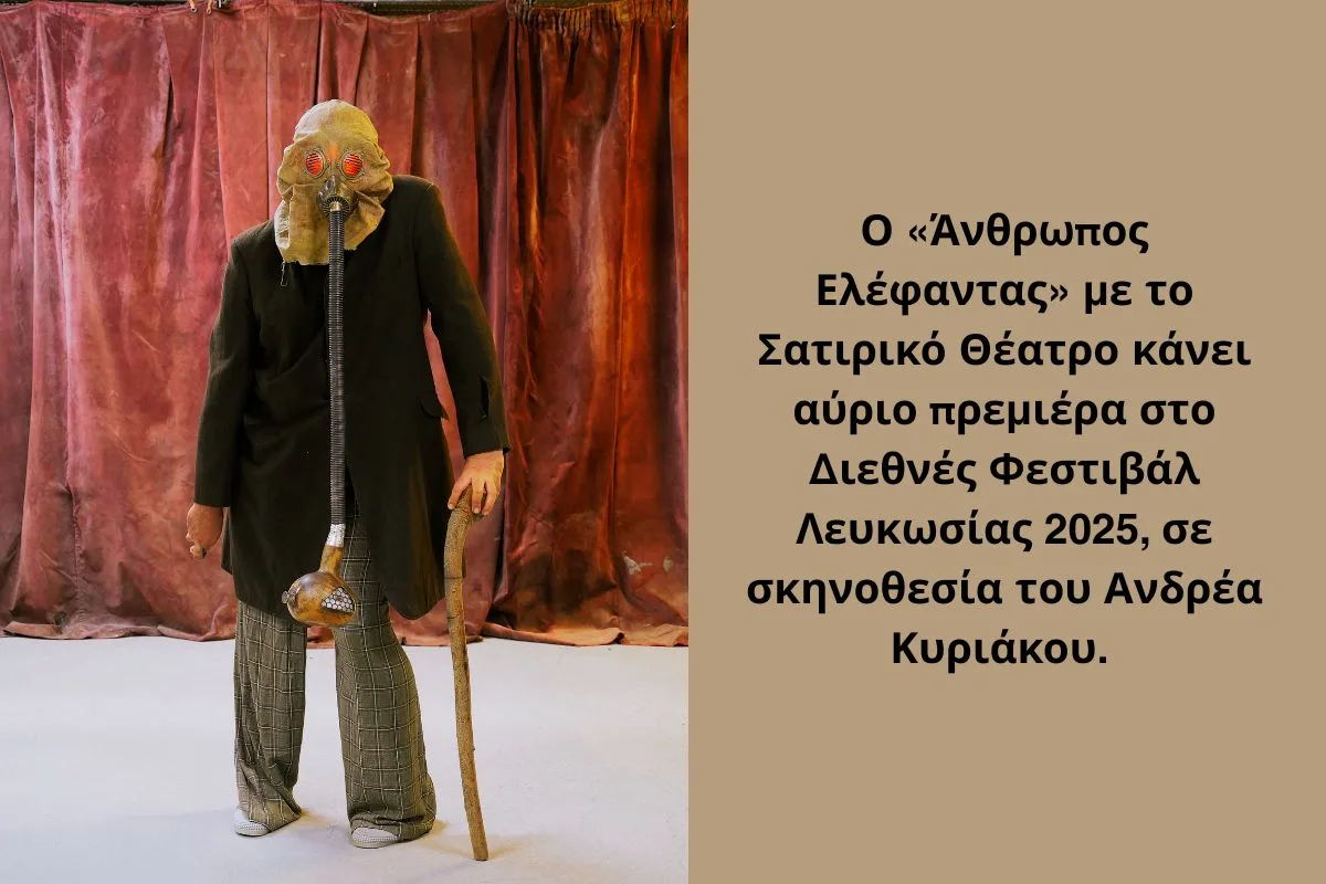 Tην πρεμιέρα της θεατρικής παράστασης «Ο Άνθρωπος Ελέφαντας» του Bernard Pomerance, παρουσιάζει το Διεθνές Φεστιβάλ Λευκωσίας 2025 σε συνεργασία με το Σατιρικό Θέατρο και την Audere Productions, σε σκηνοθεσία Ανδρέα Κυριάκου. Η παράσταση θα πραγματοποιηθεί την Παρασκευή 21 Νοεμβρίου 2025, στο Δημοτικό Θέατρο Λευκωσίας, στις 20:30μ.μ. Πρόκειται για την αληθινή ιστορία του Τζων Μέρρικ, ενός παραμορφωμένου άντρα που έζησε στο Βικτωριανό Λονδίνο το 1880 και έγινε σύμβολο της ανθρώπινης αξιοπρέπειας. Η ιστορία του ενέπνευσε συγγραφείς, επιστήμονες και δημιουργούς και μεταφέρθηκε στο θέατρο και τον κινηματογράφο με συγκλονιστικό τρόπο.