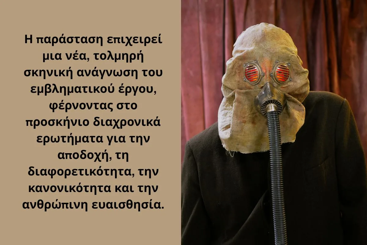 Η παράσταση επιχειρεί μια νέα, τολμηρή σκηνική ανάγνωση αυτού του εμβληματικού έργου, φέρνοντας στο προσκήνιο διαχρονικά ερωτήματα για την αποδοχή, τη διαφορετικότητα, την κανονικότητα και την ανθρώπινη ευαισθησία. Το έργο δεν παρουσιάζεται ως ιστορικό ντοκουμέντο, αλλά ως αλληγορία του σήμερα: Οι γιατροί θυμίζουν influencers, οι επισκέπτες του «freakshow», στο οποίο τον ανάγκασαν να εμφανίζεται, είναι θεατές της εποχής των social media. Η σκηνογραφία και η ενδυματολογία ακολουθούν μια γραμμή «αντιφατικού χρόνου», όπου το βικτωριανό συναντά το μοντέρνο. Η παραμόρφωση του Merrick υπονοείται μέσα από τη σκηνοθεσία, το σώμα και το φως και όχι με ρεαλιστικά μέσα. Η αφήγηση είναι πολυφωνική, με τους ηθοποιούς να αναλαμβάνουν εναλλασσόμενους ρόλους και αφηγηματικές λειτουργίες. Είναι μια σύγχρονη σκηνική ανάγνωση ενός εμβληματικού έργου, που μεταφέρει στο σήμερα διαχρονικά ερωτήματα για την κανονικότητα, την περιθωριοποίηση και τη συλλογική ευθύνη.Η σκηνοθετική προσέγγιση του Ανδρέα Κυριάκου δεν περιορίζεται σε ρεαλιστικές απεικονίσεις· αντίθετα, η παραμόρφωση του ήρωα υπαινίσσεται μέσα από φως, κίνηση και σωματικότητα, ενισχύοντας την ενσυναίσθηση χωρίς να καταφεύγει στον οίκτο. Υιοθετεί μια τολμηρή και ερευνητική θεατρική γλώσσα, στηριγμένη στη σωματικότητα, την εναλλαγή ρόλων και τη διάσπαση της αφήγησης, ενισχύοντας την ενσυναίσθηση και προσφέροντας προσβασιμότητα σε πολλαπλά επίπεδα.