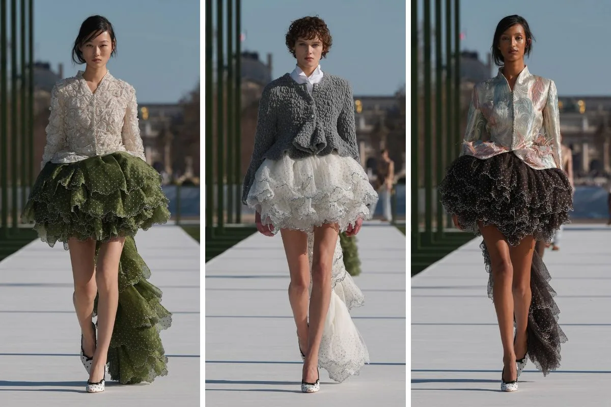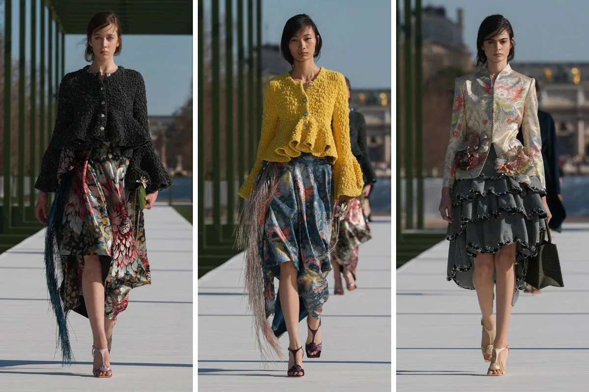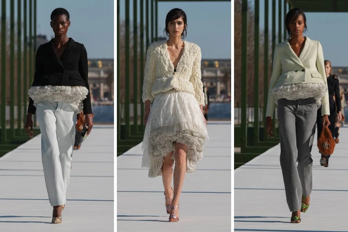 Δαντελένιες μπλούζες φορέθηκαν κάτω από αυστηρά σακάκια, ενώ λουλουδένια κεντήματα σε φορέματα και φούστες χρησιμοποιήθηκαν όχι απλώς ως διακόσμηση αλλά ως δομικά στοιχεία της σιλουέτας.