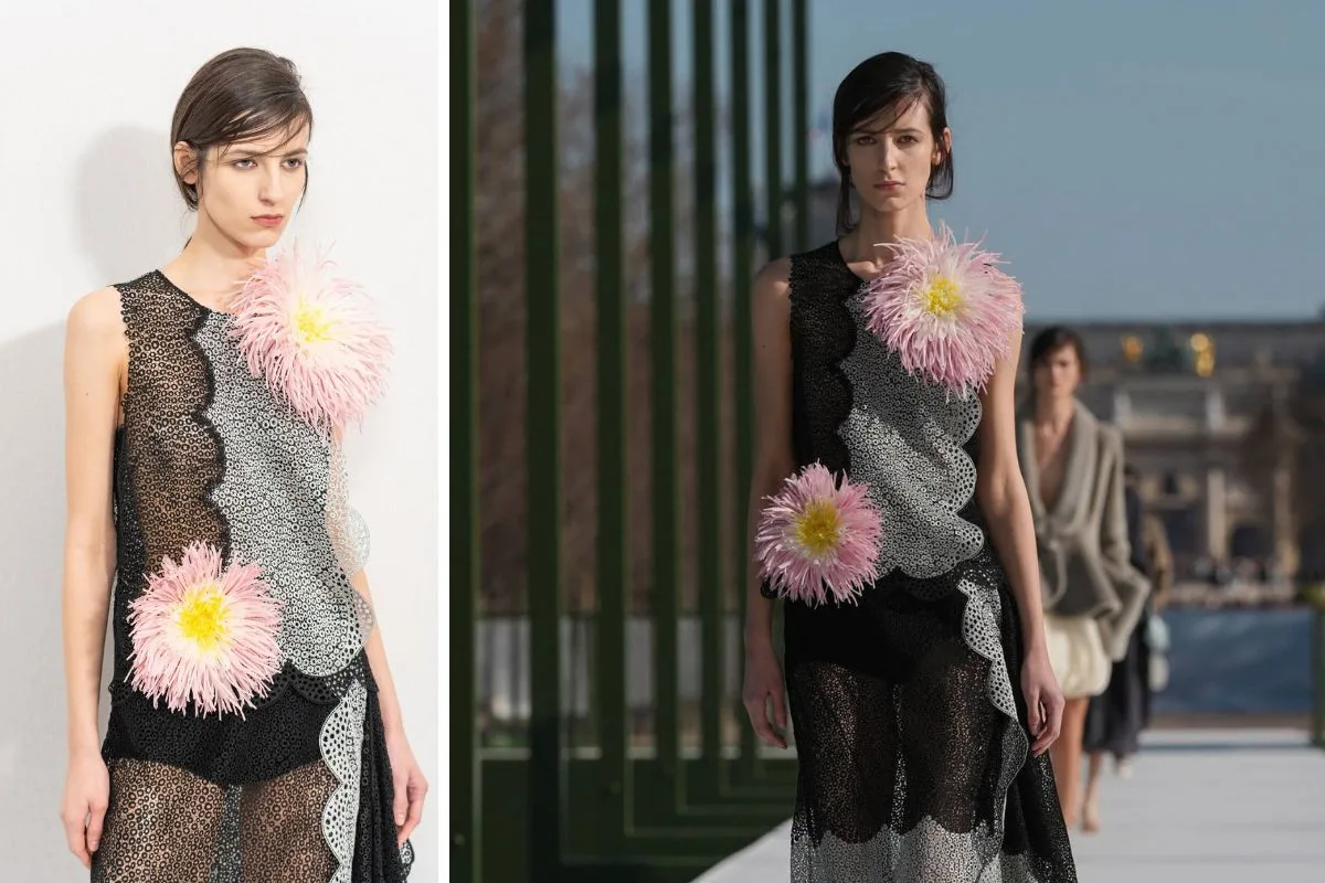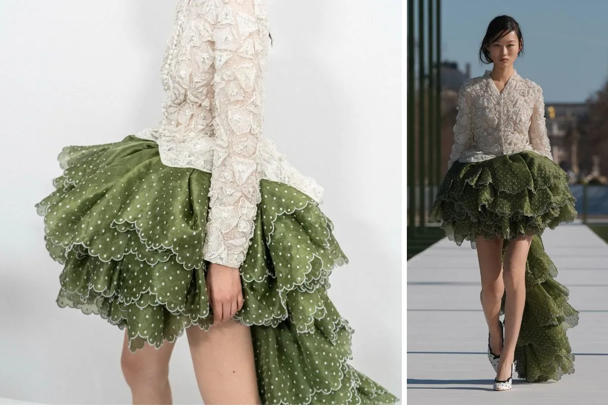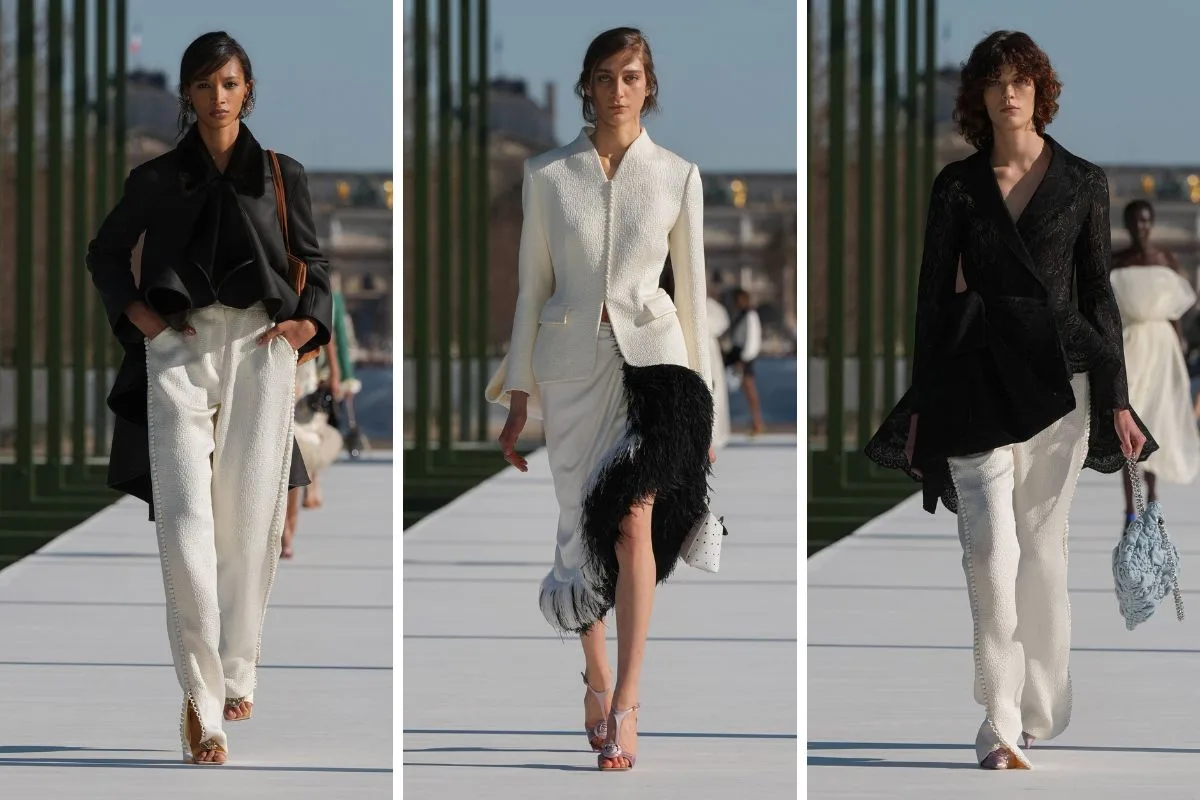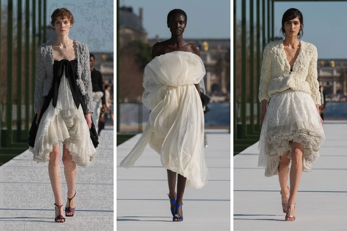 Δαντελένιες μπλούζες φορέθηκαν κάτω από αυστηρά σακάκια, ενώ λουλουδένια κεντήματα σε φορέματα και φούστες χρησιμοποιήθηκαν όχι απλώς ως διακόσμηση αλλά ως δομικά στοιχεία της σιλουέτας.