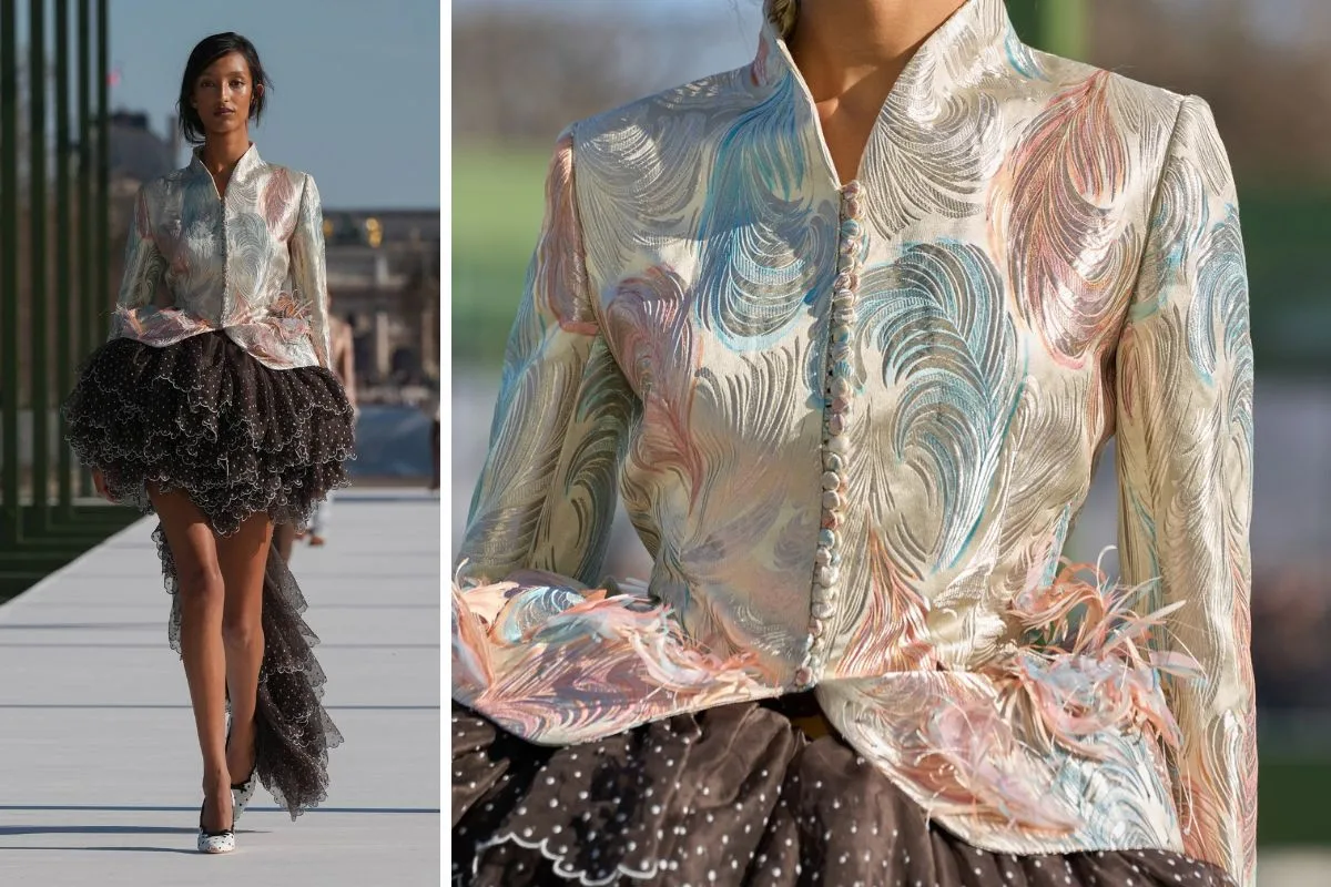 Η συλλογή κινήθηκε γύρω από μια ιδιαίτερη ιδέα: τη μόδα ως κοινωνική σκηνή. Τα μοντέλα στην πασαρέλα δεν έμοιαζαν απλώς με επισκέπτες ενός παριζιάνικου πάρκου. Έμοιαζαν με χαρακτήρες ενός αφηγηματικού κόσμου. Η αισθητική παρέπεμπε διακριτικά στη γαλλική βασιλική αυλή, όπου η ένδυση λειτουργούσε ως σύμβολο κοινωνικής θέσης.
