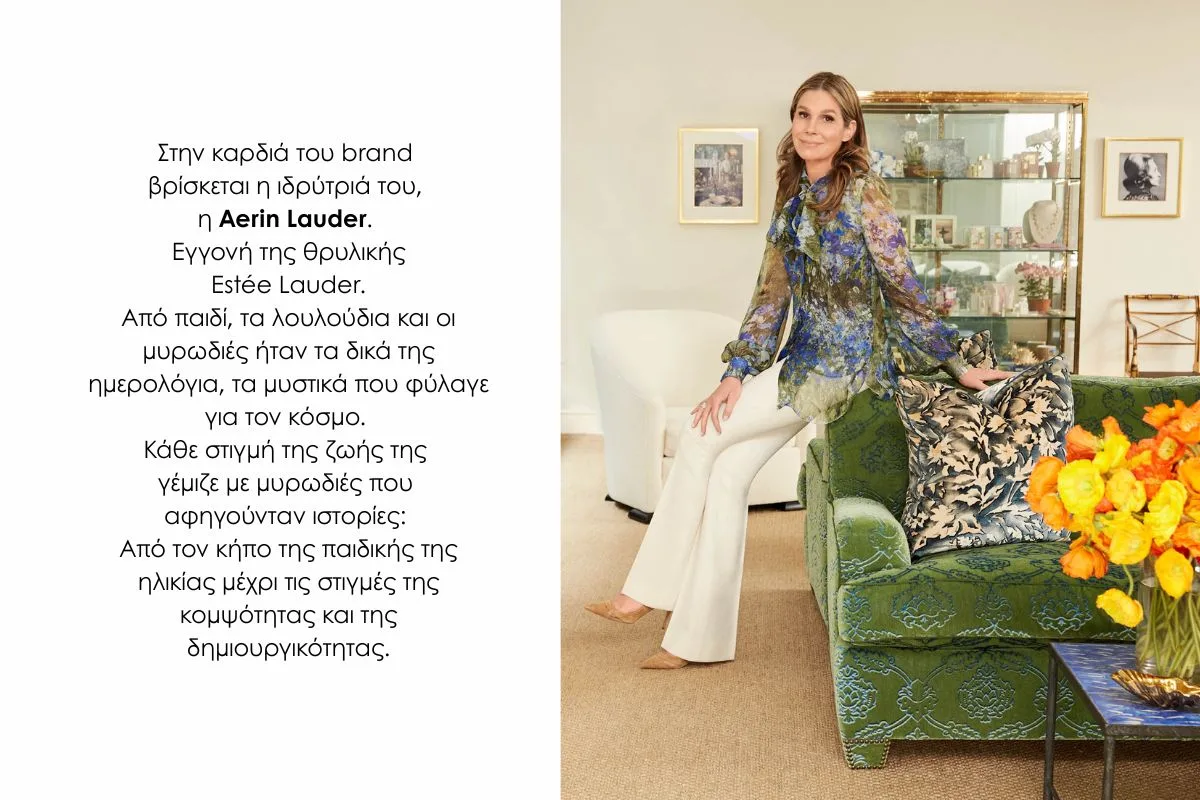 Στην καρδιά του brand βρίσκεται η ιδρύτριά του, η Aerin Lauder. Εγγονή της θρυλικής Estée Lauder, μεγάλωσε περιτριγυρισμένη από αρώματα, λουλούδια και όμορφες αναμνήσεις. Και κληρονόμησε τη μαγεία της τέχνης της ομορφιάς. Από παιδί, τα λουλούδια και οι μυρωδιές ήταν τα δικά της ημερολόγια… Ήταν τα μυστικά που φύλαγε για τον κόσμο… Κάθε στιγμή της ζωής της γέμιζε με ευωδιές που αφηγούνταν ιστορίες… Ιστορίες από τον κήπο της παιδικής της ηλικίας μέχρι τις στιγμές της κομψότητας και της δημιουργικότητας.