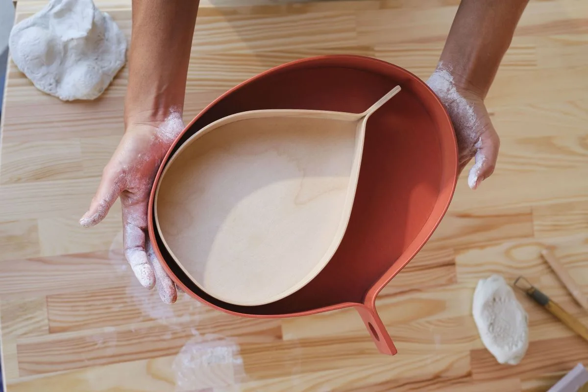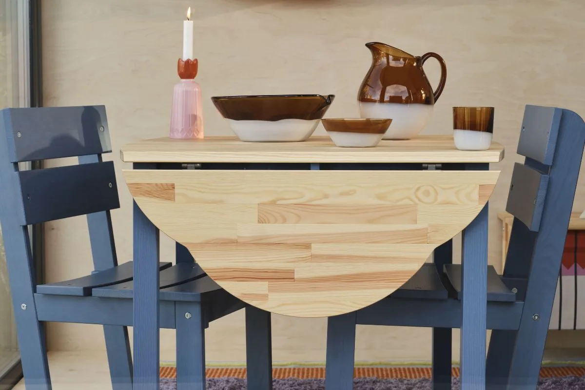 Το τραπέζι με πτυσσόμενα φύλλα αναβιώνει την ιδέα της ευέλικτης επίπλωσης για μικρούς χώρους, ενώ η καρέκλα με ελαφρώς κεκλιμένη πλάτη και ενισχυμένη κατασκευή εξασφαλίζει άνεση και στιλιστική λεπτομέρεια. Το τριγωνικό σκαμπό, μικρό και ελαφρύ, εμπνέεται από παραδοσιακά σκαμνιά και προσαρμόζεται εύκολα σε κάθε σημείο του σπιτιού.