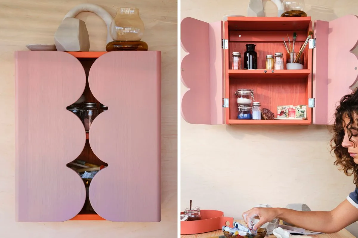 Ο πάγκος με αποθηκευτικό χώρο συνδυάζει την πρακτικότητα των μπαούλων του 19ου αιώνα με μοντέρνα μοτίβα. Υπάρχει βέβαια και τη δυνατότητα αλλαγής του κλεισίματος ή του υφάσματος του. Επίσης, αυτό το ροζέ ντουλαπάκι με τις καμπύλες παραπέμπει στα διακοσμητικά έπιπλα αποθήκευσης της εποχής. Ωστόσο, καταφέρνει να προσφέρει κομψότητα και λειτουργικότητα.