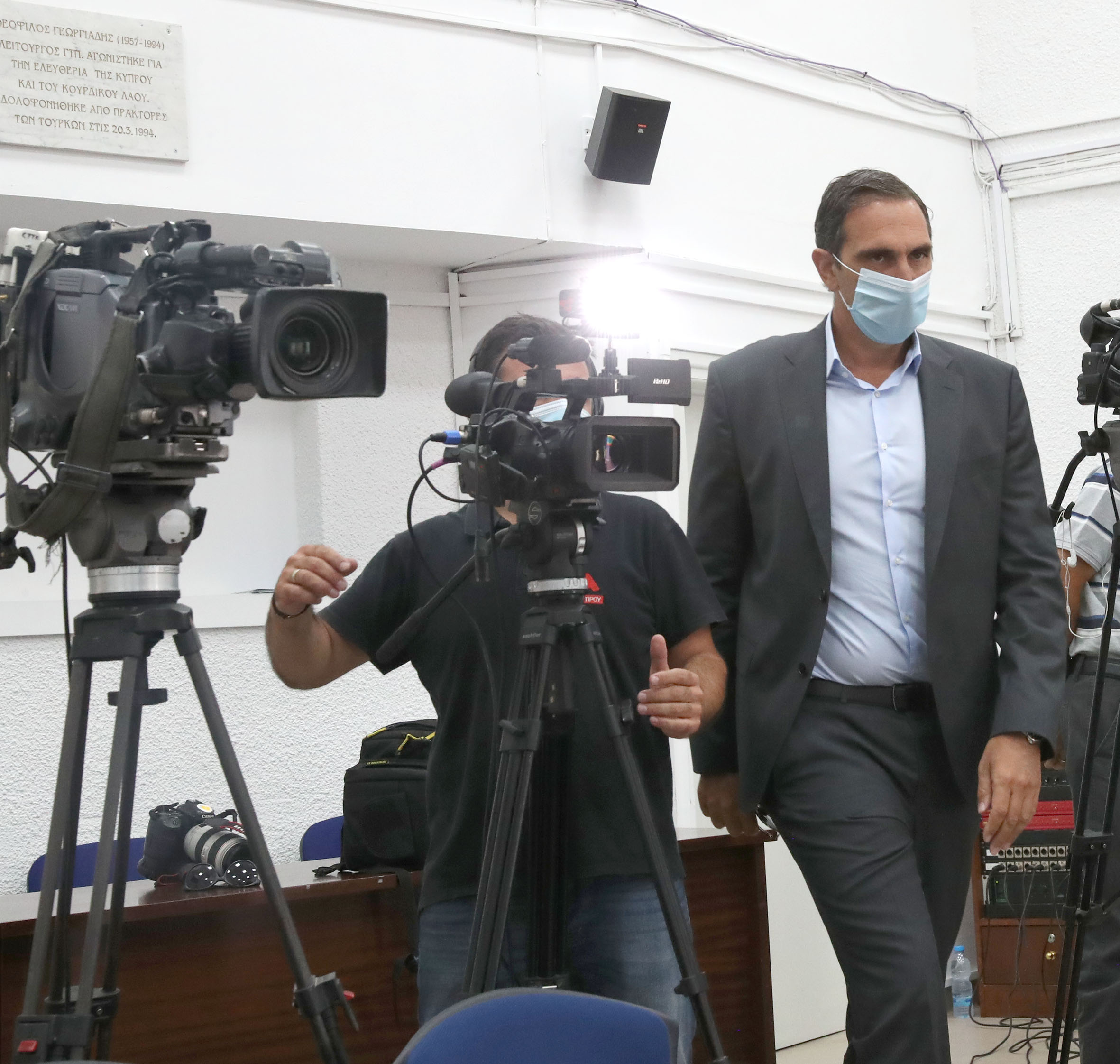 Ο Υπουργός Υγείας κ. Κωνσταντίνος Ιωάννου προσέρχεται στη συνέντευξη Τύπου για τις τελευταίες εξελίξεις αναφορικά με την πανδημία του κορωνοϊού. Γραφείο Τύπου και Πληροφοριών (Αμφιθέατρο «Θεόφιλος Γεωργιάδης»), Λευκωσία, Κύπρος