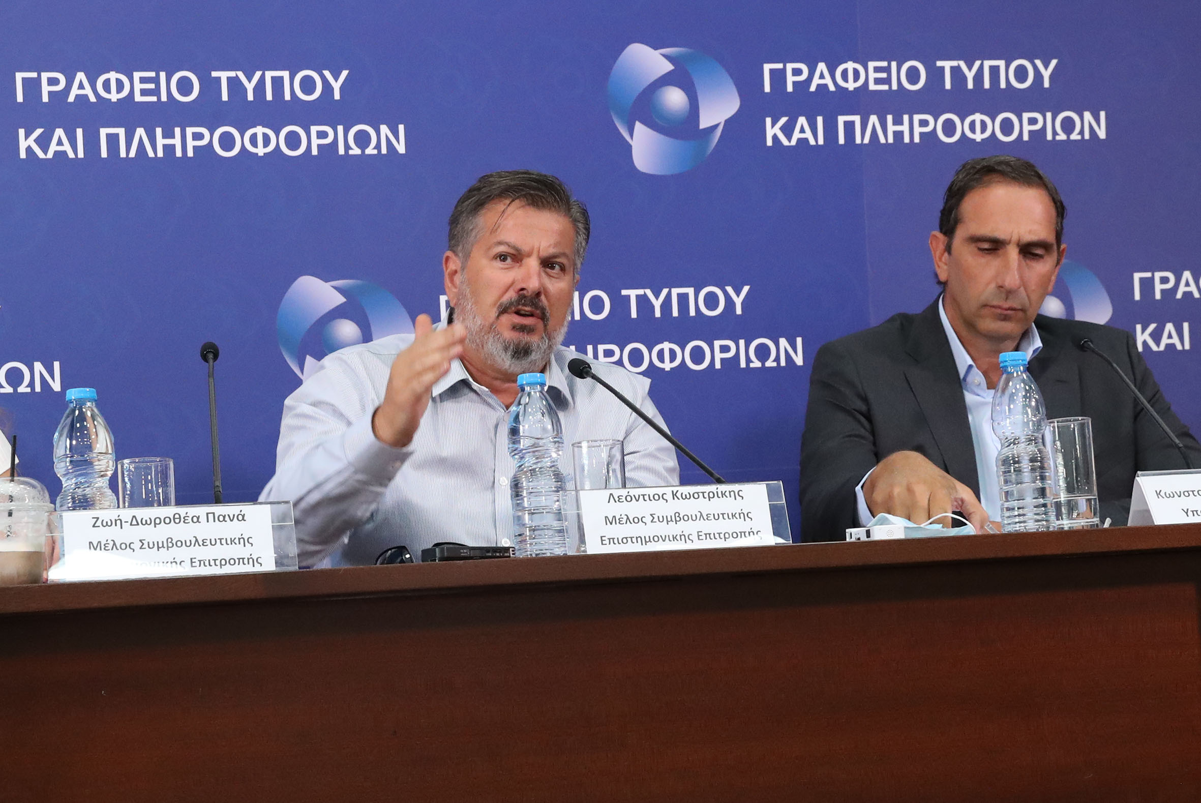 Ο Λεόντιος Κωστρίκης και ο Υπουργός Υγείας κ. Κωνσταντίνος Ιωάννου παραθέτει συνέντευξη Τύπου για τις τελευταίες εξελίξεις αναφορικά με την πανδημία του κορωνοϊού. Γραφείο Τύπου και Πληροφοριών (Αμφιθέατρο «Θεόφιλος Γεωργιάδης»), Λευκωσία, Κύπρος