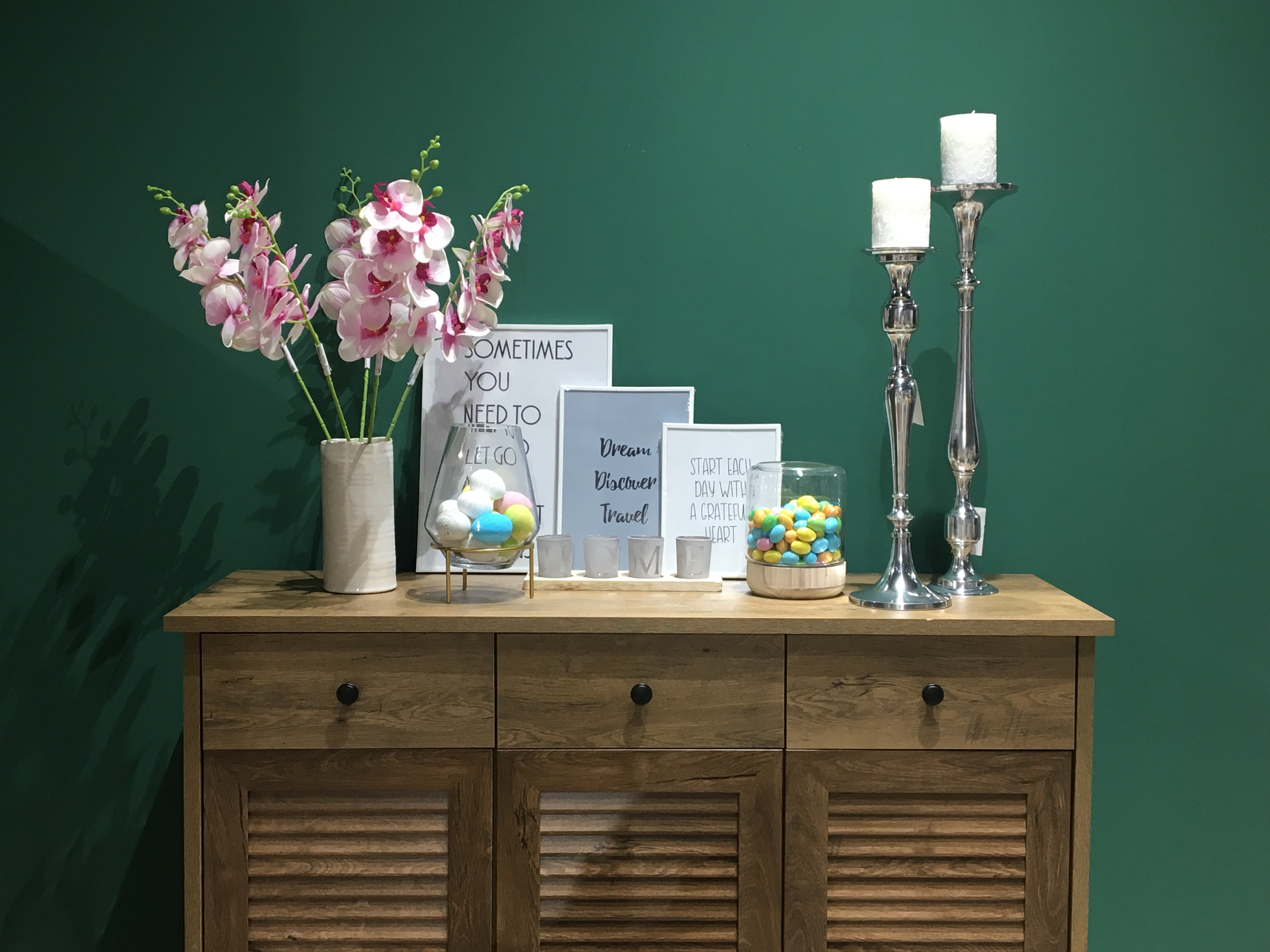 Τι γίνεται όμως και με τα τριγύρω έπιπλα που φιλοξενούνται στην τραπεζαρία σας; Για παράδειγμα, το μπουφέ σας, θα το αφήσετε «γυμνό»; Όχι, καλέ! Στα ράφια του καταστήματος JYSK θα εντοπίσετε χίλια μύρια καλά! Όπως για παράδειγμα τα μεταλλικά υψηλά κηροπήγια, που δίνουν και αρχοντιά και φινέτσα, όπου κι αν τα χρησιμοποιήσετε. Εμείς τα τοποθετήσαμε στη δεξιά πλευρά του μπουφέ και έδωσαν το δικό τους επιβλητικό στίγμα στη διακόσμηση. Στη συλλογή των κεριών του JYSK επίσης, θα βρείτε κι αυτά που χρησιμοποιήσαμε κι εμείς, που μοιάζουν με δαντέλα! Απλά, υπέροχα!