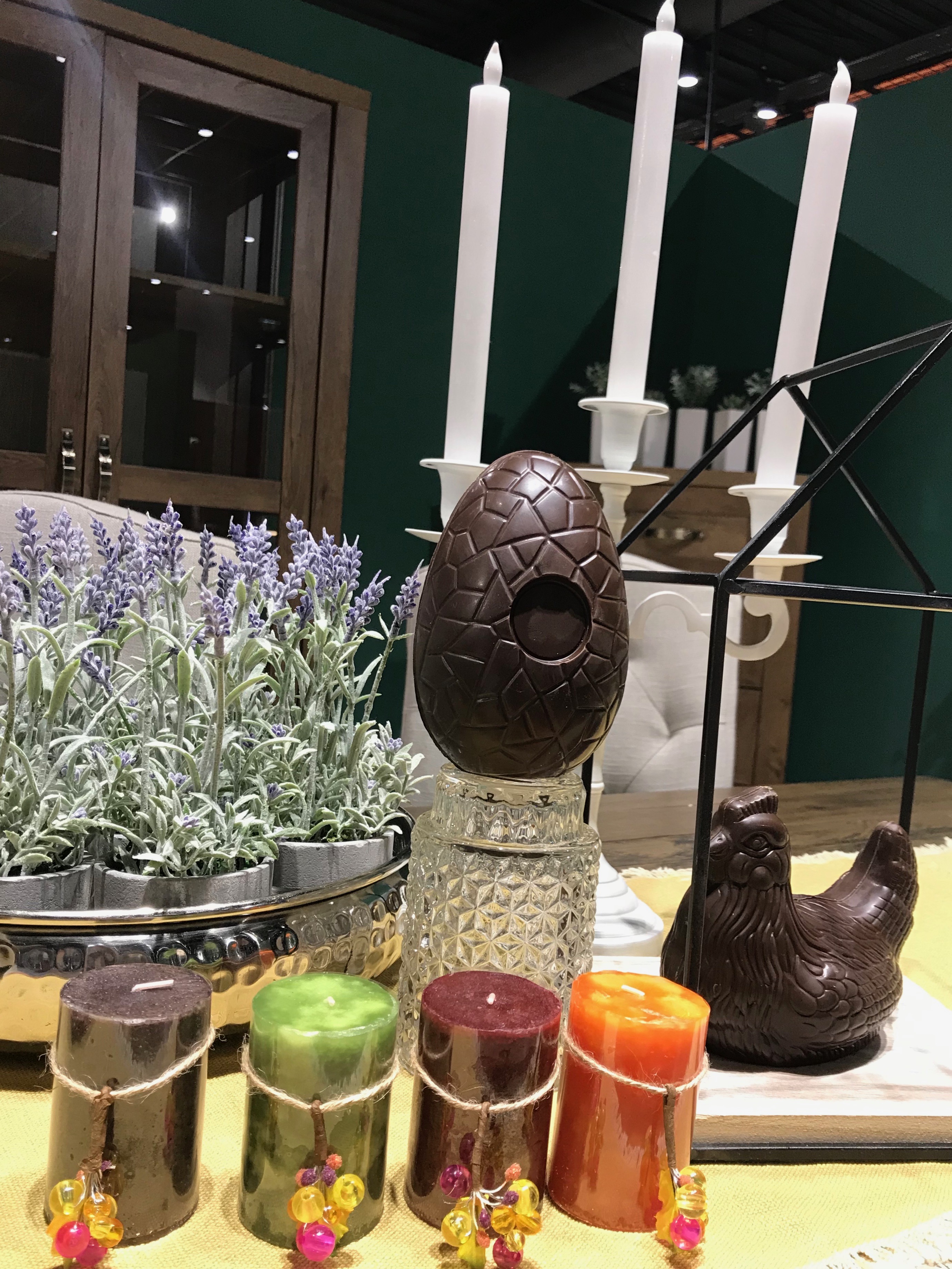 Δυο διάφανα δοχεία πολλαπλών χρήσεων, το ένα με μεταλλική και το άλλο με ξύλινη βάση, έγιναν οι καλύτεροι «αποδέκτες» των πασχαλινών αυγών μας! Στο ένα βάλαμε τα πολύχρωμα βαμμένα αυγά μας. Το δεύτερο το γεμίσαμε με μικροσκοπικά σοκολατένια αυγά, που έδωσαν και χρώμα και στιλ στην επιφάνεια του μπουφέ μας.