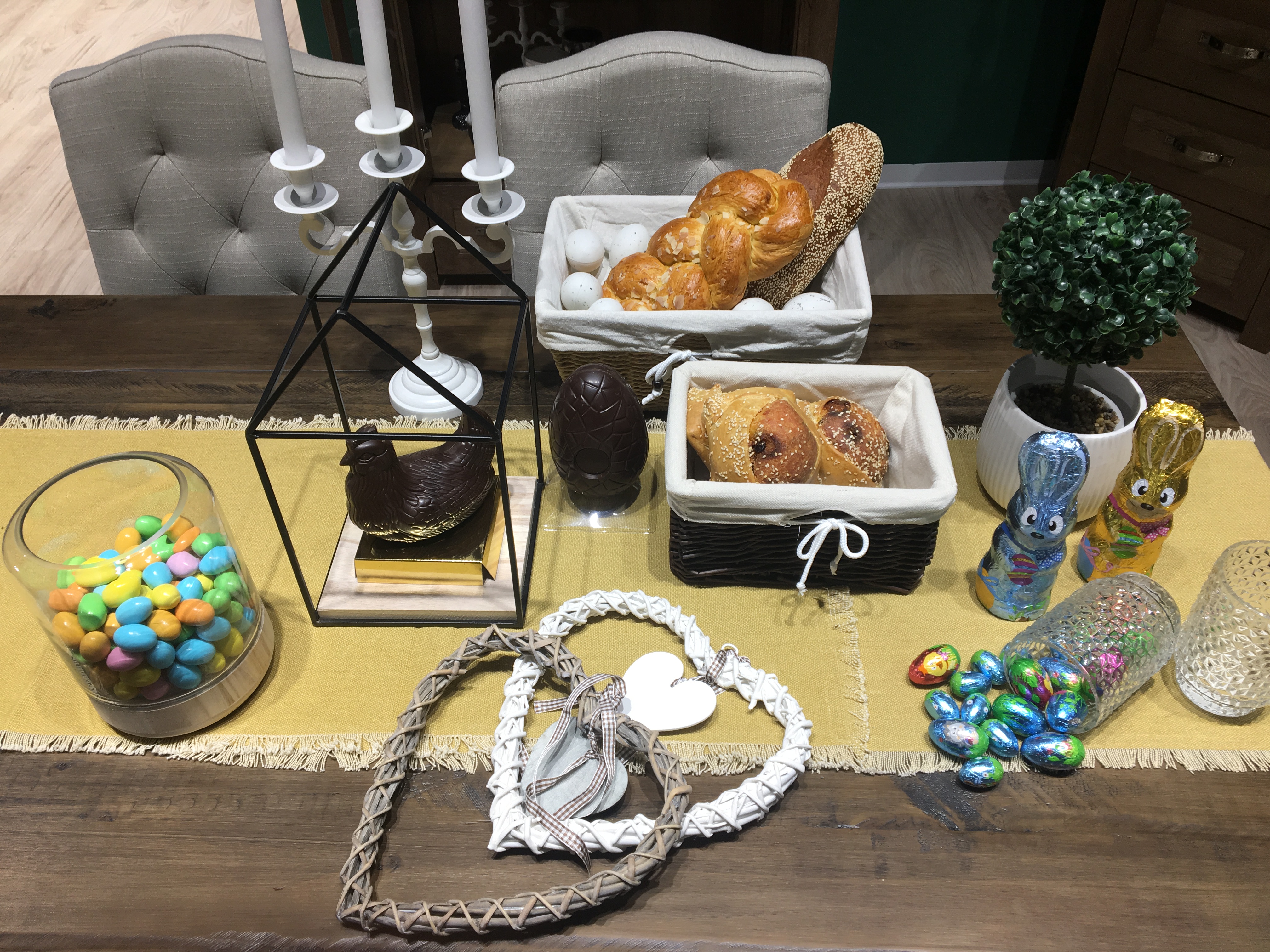 * Στρώστε το καλό σας λινό τραπεζομάντιλο ή καλύτερα ένα runner, σε μουσταρδί χρώμα και προσθέστε μερικές πασχαλινές πινελιές! Ανακαλύψτε λοιπόν, γυάλινα ποτηράκια μετρίου μεγέθους, που εδώ παίζουν το δικό τους ρόλο! Γεμίστε τα με χρωματιστά, σοκολατένια αβγά για να δώσουν το γιορτινό χρώμα στο τραπέζι σας.