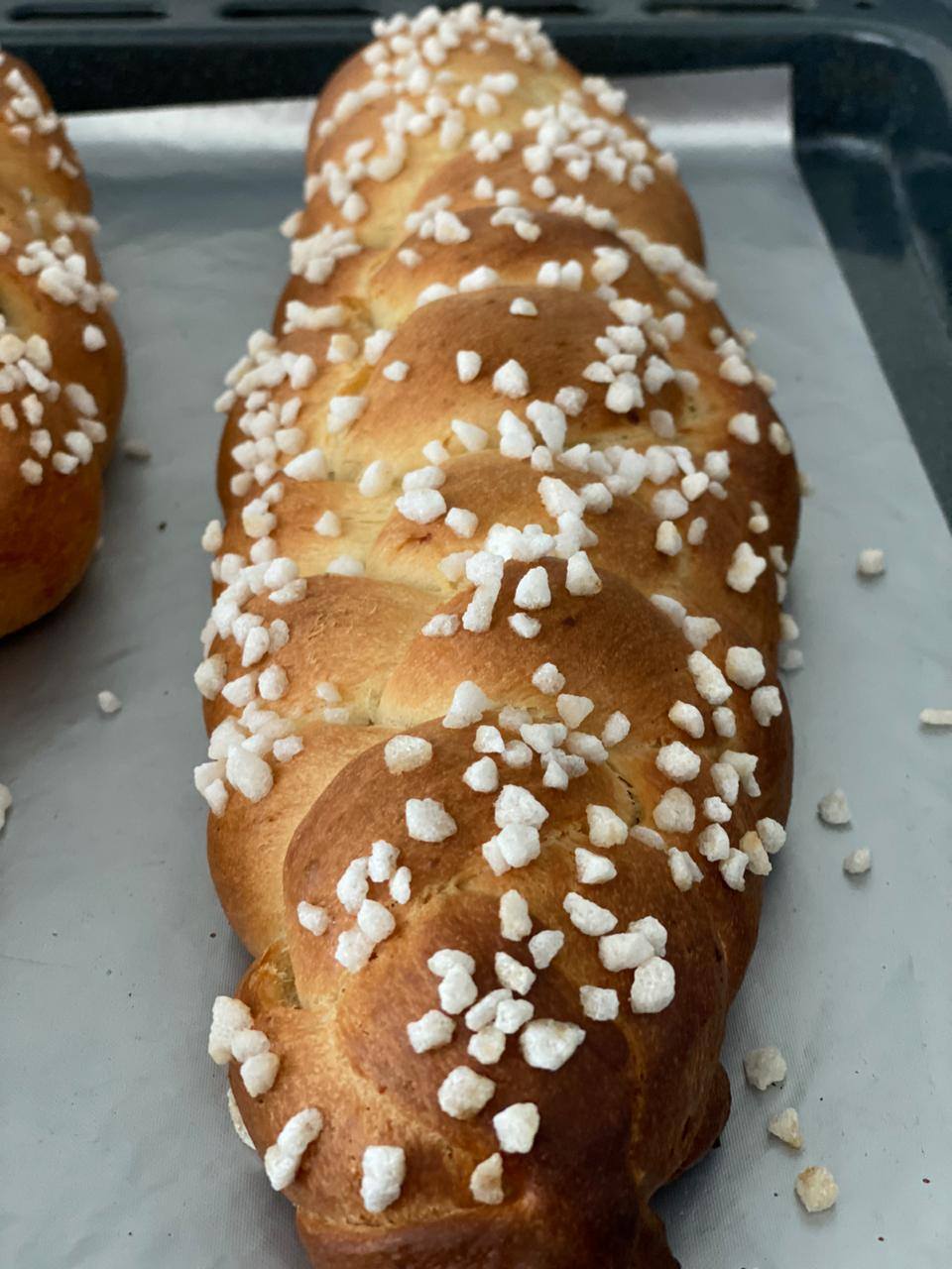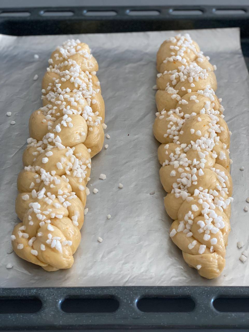 Sourdough Tsoureki Recipe and tutorial: ingredients: sweet starter (see below), 400 gr + extra 50-60gr sbf, 50 gr water, 90 + 50 gr uns. butter at room temperature, 130 honey, 10 gr mahlep seeds, 1.5 gr mastic (not more as it will be bitter), zest of 1 orange, 2 vanilla sugar sachets (total 10 gr), pinch of salt 2 eggs room temperature, 1 egg white for glazing or milk, almond flakes or pearl sugar for topping. 1. sweet active starter – 50gr active s/d, 75 sbf, 38 water, 37 milk, 30 sugar. 2. in a small blender or a coffee grinder blend/grind the mahlep seeds, the mastic, the pinch of salt and the vanilla sugar until it becomes finely grounded – won’t become totally powdered (this is your spice mixture). 3. in a small pan over low fire dissolve the honey and 90gr of butter stir constantly (DO NOT overheat). when butter has almost melted add the spice mixture and continue to mix for a minute till all blended. remove from fire (MUST BE WARMISH NOT HOT) add orange zest & mix then slowly add the 2 beaten eggs (hence why it shouldn’t be hot). allow to cool a few minutes. 4. in the mixer add 50 gr water, all the active sweet starter, 400gr sbf mix just to incorporate ingredients and add the mixture of 3 above. mix medium speed for 10-15 min (till the dough does not stick on the bowl so here is where you might need the extra 50 gr flour. add extra four as needed) 5. when your dough is non sticking and firm, mix in little by little the extra 50 gr of butter. when done dough should look like in the video. 6. bench proof overnight for dough to almost double (it’s a dead slow dough!! It takes about 12 hours) 7. braid as u wish, I make a 4 braid with the pattern 4/2-1/3-2/3 which basically means that braid 4 goes to braid 2 then braid 1 goes over braid 3 and so forth until you finish. You have about 1120 gr total dough. I make 2 smaller 4-braided tsoureki and each braid is about 138gr each. 8. coat with milk (I prefer it over egg white), top with almond flakes or pearl sugar. Bake on preheated oven at 180c for 25-30 min. i COVER with silver foil after the first 10-14 min so they don’t get too brown. 9. Happy Baking #tsoureki #challah #sourdough #braidedbread