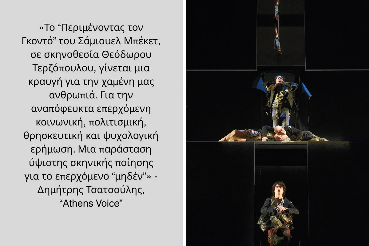 «Το “Περιμένοντας τον Γκοντό” του Σάμιουελ Μπέκετ, σε σκηνοθεσία Θεόδωρου Τερζόπουλου, γίνεται μια κραυγή για την χαμένη μας ανθρωπιά. Για την αναπόφευκτα επερχόμενη κοινωνική, πολιτισμική, θρησκευτική και ψυχολογική ερήμωση. Μια παράσταση ύψιστης σκηνικής ποίησης για το επερχόμενο “μηδέν”» – Δημήτρης Τσατσούλης, “Athens Voice”