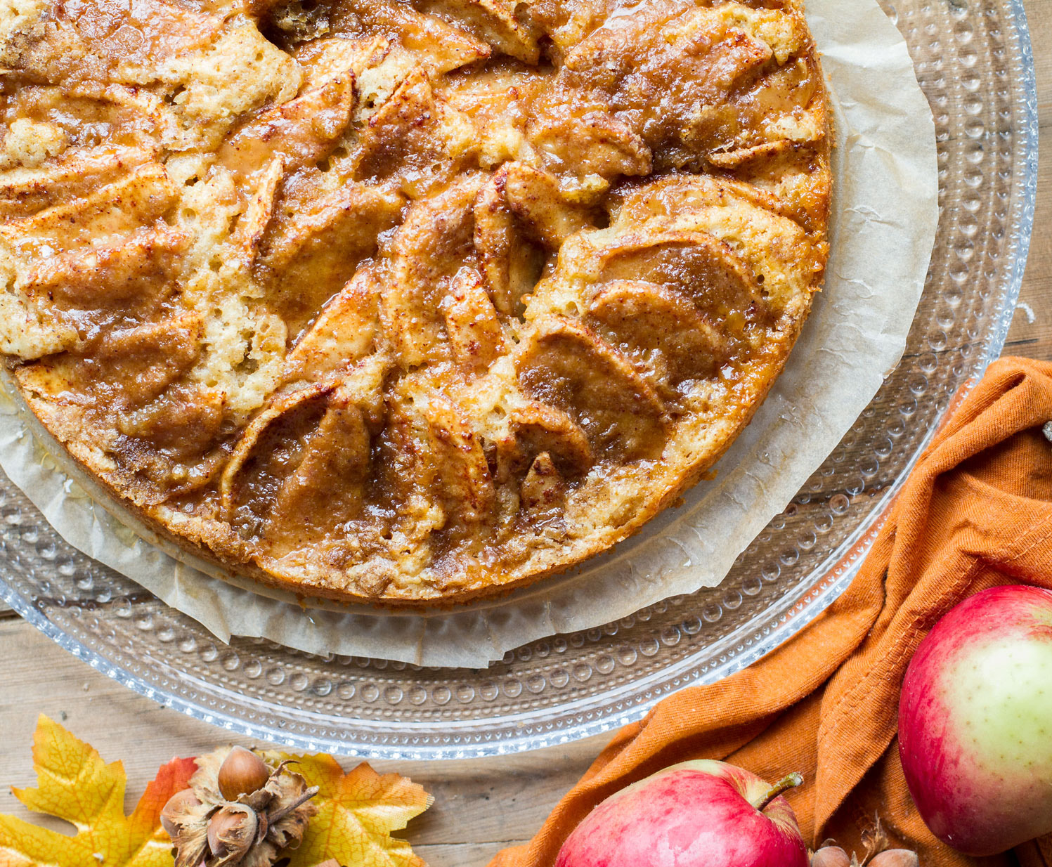 Λαδώνουμε και αλευρώνουμε ένα ταψί και ρίχνουμε μέσα το μίγμα. Τοποθετούμε επάνω στο μίγμα τις υπόλοιπες φέτες μήλου και ψήνουμε σε προθερμασμένο φούρνο στους 180ο C βαθμούς για 40 λεπτά.