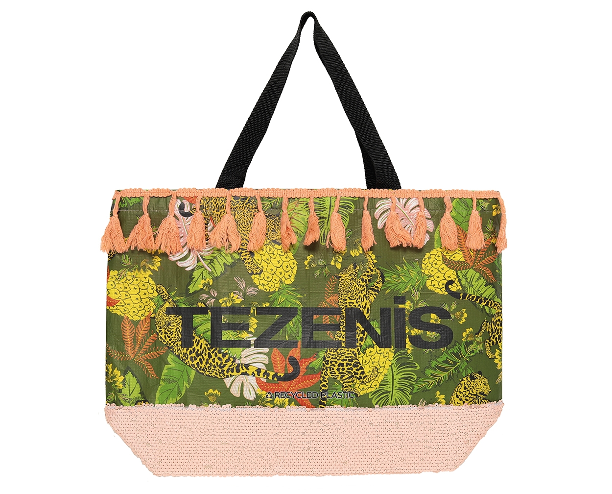 Η κάθε νέα τσάντα Tezenis δημιουργείται από 7 χρησιμοποιημένες πλαστικές μπουκάλες και θα τις βρεις σε 5 σχέδια που θυμίζουν τα μαγιό του brand. Οι τσάντες έχουν μοναδικές στιλάτες λεπτομέρειες όπως pom-poms, sequins και κρόσσια, κάνοντας τις το τέλειο αξεσουάρ για να σε συνοδεύει παντού αυτό το καλοκαίρι.
