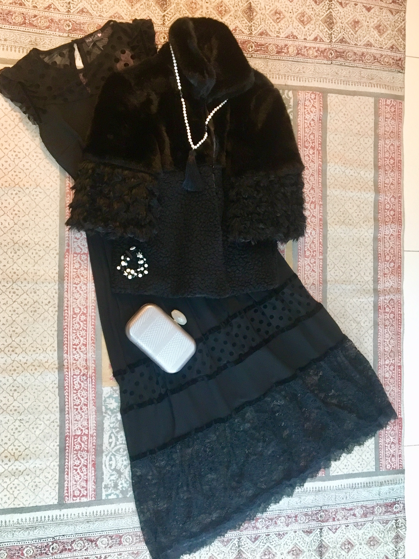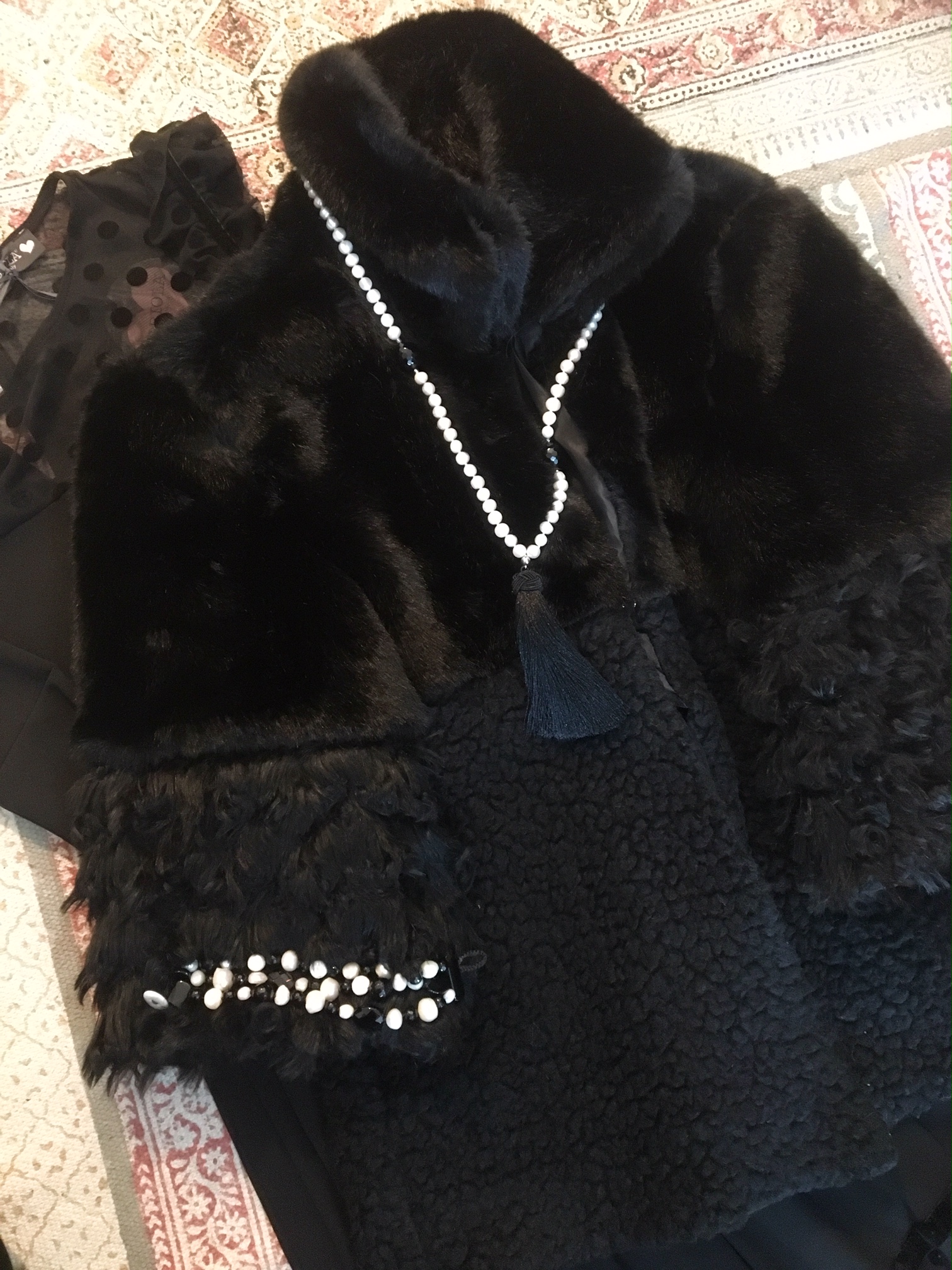 Από πάνω θα φορέσεις ένα μαύρο πανωφόρι με τρία τέταρτα μανίκι, επίσης Ιταλικής προέλευσης, Giorgia & Johns. Ο συμμετρικός συνδυασμός συνθετικής γούνας με wool μοτίβα δημιουργεί ένα ξεχωριστό κομμάτι για τη γκαρνταρόμπα σου.