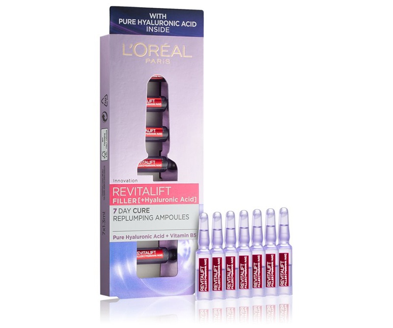 Αμπούλες εμπλουτισμένες με καθαρό υαλουρονικό οξύ στην υψηλότερη συγκέντρωση συγκριτικά με τα υπόλοιπα προϊόντα L’Oréal Paris και βιταμίνη Β5. Ενυδατώνουν εντατικά και ανορθώνουν την επιδερμίδα μέσα σε μόλις 7 ημέρες, σε 6 βασικά σημεία του προσώπου.