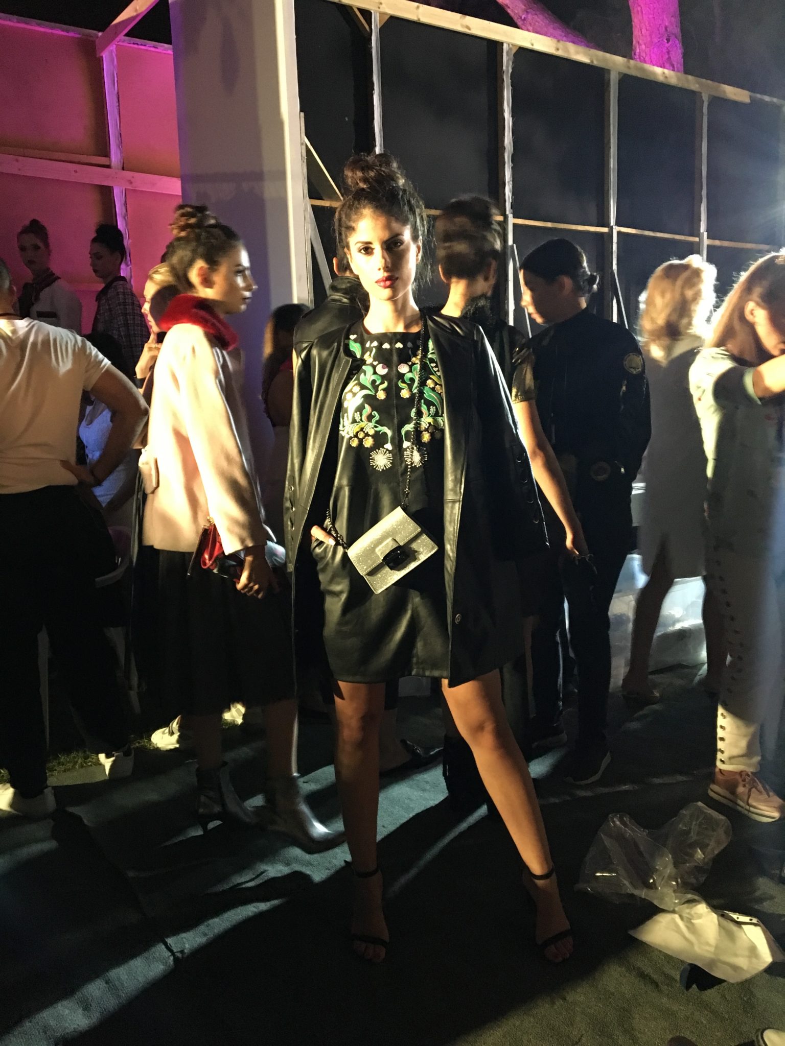 Η παρουσίαση της συλλογής Trussardi Jeans ξεκίνησε με ένα μοντέλο που φορούσε ένα δεμάτινο, εφαρμοστό μαύρο παντελόνι που έδεσε τέλεια με ένα μίνι δερμάτινο φόρεμα κι ένα μικρό, κομψό βελούδινο belt bag. Γι’ αυτό και απέσπασε το χειροκρότημα του κοινού… Ένα δερμάτινο κεντημένο φόρεμα, από τα πιο αντιπροσωπευτικά κομμάτια της συλλογής της Gaia Trussardi, συνδυάστηκε με κοντό παλτό από δέρμα, για το απόλυτο romantic touch στην όλη εμφάνιση.