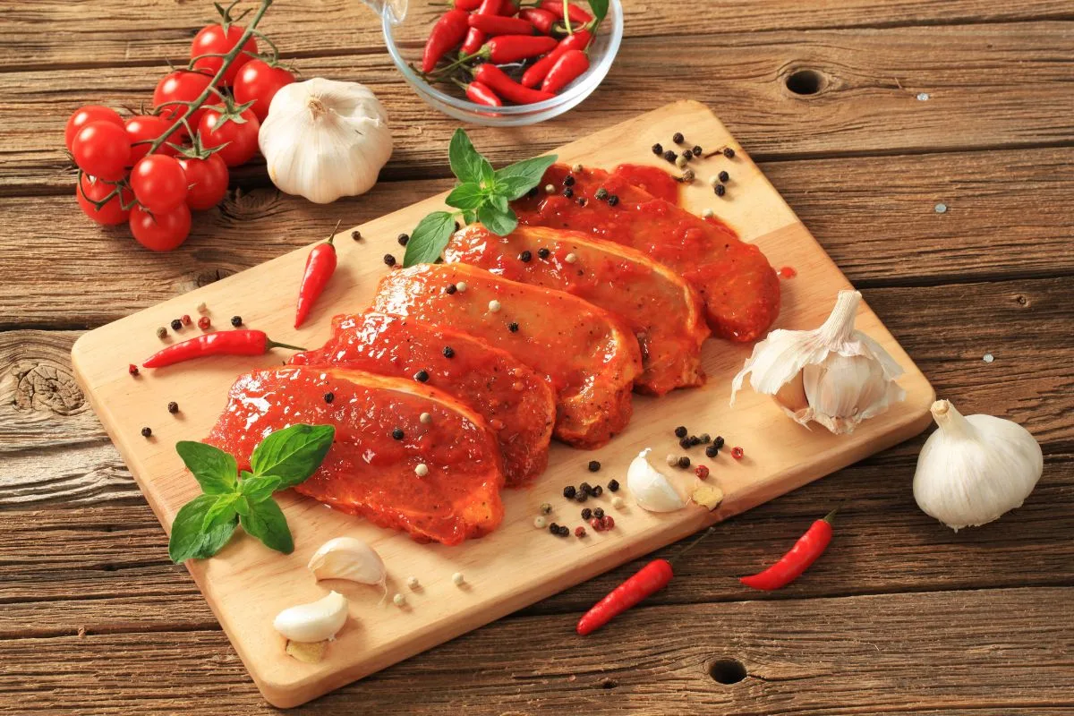 Χτυπάτε τις μπριζόλες για να πάρουν ίσο πάχος, που να μην υπερβαίνει τα 2 εκ. περίπου. Διαλύετε σε μια λεκάνη το αλάτι σε 2 φλ. νερό (κρύο, από τη βρύση) και τις βάζετε μέσα. Σκεπάζετε τη λεκάνη, τη βάζετε στο ψυγείο και τις αφήνετε στην άρμη για 1 ώρα. Στο μεταξύ ετοιμάζετε τα κάρβουνα ή προθερμαίνετε την ψησταριά, βάζοντας πάνω μια σχάρα να ζεσταθεί. Αναμιγνύετε σε ένα μπολ την καστανή ζάχαρη με το τσίλι, την πάπρικα, τη μουστάρδα, τη σκόνη κρεμμυδιού, τους αλεσμένους κόκκους πιπεριού, το κέτσαπ και το ξίδι.