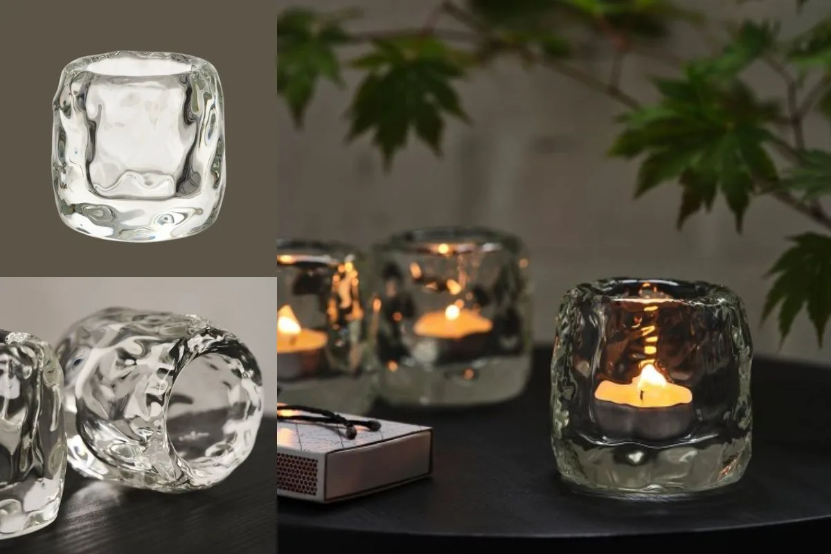 Τέλος, σκόρπισε σε διάφορα σημεία του χώρου τις βάσεις για κερί ρεσό της ίδιας, από χοντρό, διαφανές γυαλί… Κι όταν ανάψεις τα κεράκια τους, η φλόγα θα πλημμυρίζει τον χώρο με ζεστασιά.