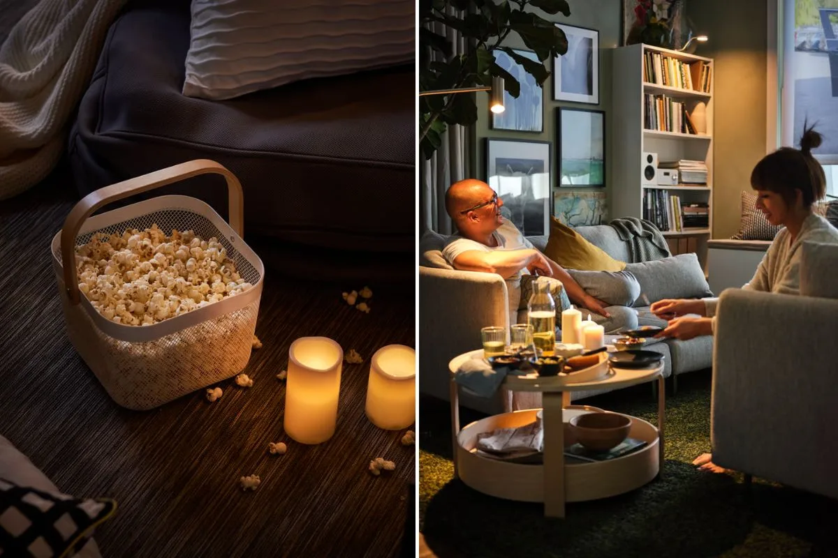 Κι όταν το δείπνο τελειώσει, η νύχτα συνεχίζεται στο σαλόνι, που γίνεται η καρδιά της βραδιάς. Δημιουργήστε λοιπόν, μια γωνιά κινηματογράφου, επιλέγοντας ρομαντικές ταινίες ή σειρές. Μαξιλάρια προστίθενται, ριχτάρια τραβιούνται πιο κοντά και ο τριθέσιος καναπές με σεζλόνγκ, όπως ο HYLTARP, μετατρέπεται σε ένα κοινό καταφύγιο. Σνακ και ποτά βρίσκονται δίπλα, τα κεριά τρεμοπαίζουν απαλά και ο φωτισμός χαμηλώνει, γίνεται πιο ζεστός. Ο έξω κόσμος σβήνει. Μια αγαπημένη ταινία παίζει, οι συζητήσεις συνεχίζονται ανάμεσα στις σκηνές και η άνεση γίνεται η απόλυτη πολυτέλεια. Κάθε λεπτομέρεια – απαλά υφάσματα, ατμοσφαιρικός φωτισμός, προσεγμένα αξεσουάρ – συνεργάζεται για να δημιουργήσει έναν χώρο φτιαγμένο για να τον ζήσετε μαζί. Τελικά, δεν έχει και τόση σημασία η ταινία που θα παρακολουθήσετε, αλλά το πώς νιώθετε τον χώρο… Θα είναι χαλαρός, φιλόξενος και ιδανικός για στιγμές που κρατούν και μετά τα μεσάνυχτα.