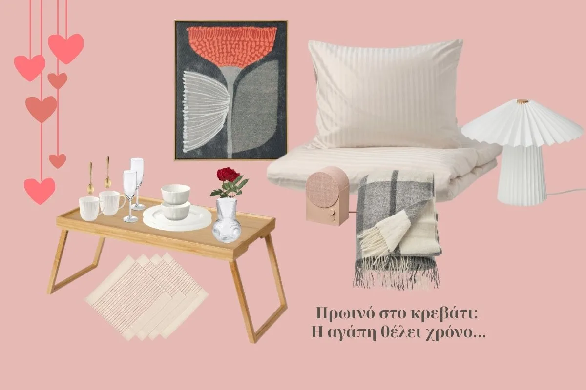 Φέτος, ο Άγιος Βαλεντίνος έρχεται Σάββατο… Επομένως, η ημέρα θα ξεκινήσει ήσυχα, με χαλαρή διάθεση. Το πρωινό φως περνά απαλά ανάμεσα από τις κουρτίνες, η μουσική παίζει χαμηλά… Κι εσύ σκέφτεσαι πως να εντυπωσιάσεις τον καλό σου… Γι’ αυτό ανάλαβε να σερβίρεις το πρόγευμα σας στο κρεβάτι… Θα χρειαστείς απλά έναν δίσκο που πλαισιώνεται από ζεστές υφές και γήινους τόνους. Καθαρά λευκά είδη, επιπλέον μαξιλάρια κι ένα απαλό ριχτάρι θα σας προκαλούν να μείνετε λίγο ακόμη στο κρεβάτι.