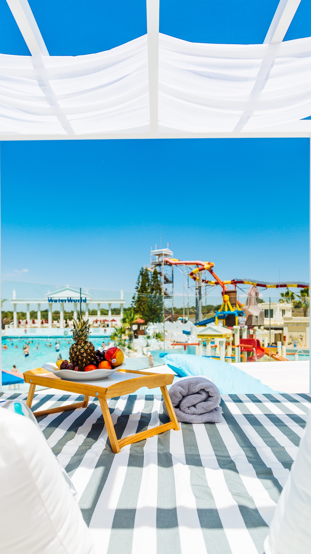 Εκτός από την πληθώρα παιχνιδιών και τους μοναδικούς χώρους αναψυχής, στο WaterWorld Water Park μπορείτε να χαλαρώσετε στα μεγάλα αναπαυτικά κρεβάτια (THEA BEACH CABANAS)… Παράλληλα, όσοι θέλουν να βιώσουν την απόλυτη πολυτέλεια, μπορούν να επιλέξουν την THEA VIP SUITE. Με μεσογειακό σχεδιασμό, για την απόλυτη άνεση και με πανοραμική θέα, η σουίτα διαθέτει μεγάλο σαλόνι με εντυπωσιακό φαγητό, υδρομασάζ με θέα στο WaterWorld, ευρύχωρο αποδυτήριο και μοντέρνο μπάνιο.