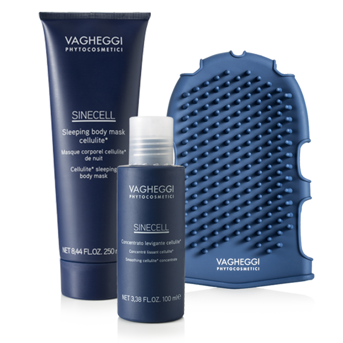 [bs_icon name=”glyphicon glyphicon-heart”] Sinecell, Cellulite System Kit της Vagheggi Phytocosmetics, πρωτοποριακό κιτ φυτικών και δραστικών προϊόντων, για καθημερινή χρήση στο σπίτι. Βελτιώνει την όψη φλούδας πορτοκαλιού, με λιποδιαλυτική, αντιοξειδωτική και ταυτόχρονα εξισορροπητική και ενυδατική δράση. Περιλαμβάνει το [bs_icon name=”glyphicon glyphicon-heart”] SMOOTHING CELLULITE CONCENTRATE, έναν συμπυκνωμένο δραστικό ορό που χρησιμοποιείται 2-3 βράδια την εβδομάδα κάνοντας μασάζ με το γάντι και αφαιρείται στο ντους. Επαναλαμβάνεις μία φορά την εβδομάδα. Το δεύτερο προϊόν είναι η CELLULITE SLEEPING BODY MASK, μια κρεμώδης μάσκα ύπνου, διπλής δράσης: κρέμα και μάσκα μαζί, που μένει όλο το βράδυ, δεν αφαιρείται και αφήνει την επιδερμίδα τονωμένη και σφριγηλή, ενώ ταυτόχρανα διεισδύει τα ευεργετικά συστατικά κατά της κυτταρίτιδας. Το πρωί θα νιώσεις το δέρμα σου πιο συμπαγές και πολύ απαλό. Μαζί τους θα βρεις και ένα ειδικό γάντι σιλικόνης 2 όψεων για μασάζ και τόνωση της κυκλοφορίας των περιοχών με κυτταρίτιδα. Ενισχύει τη δράση των προϊόντων και αυξάνει τη μικροκυκλοφορία.