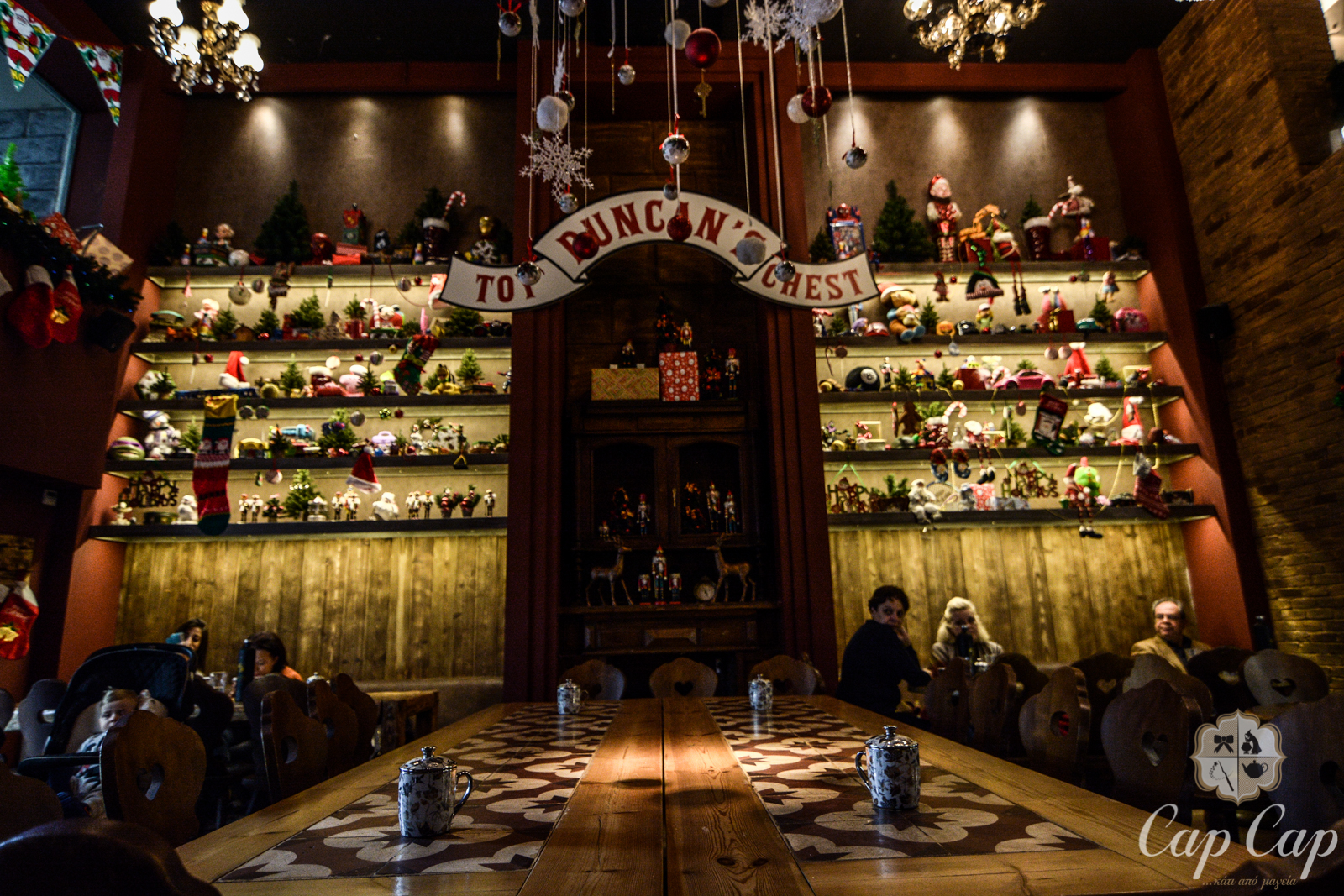 Είναι ένα από τα πιο επιτυχημένα θεματικά καφέ που θα ανακαλύψεις σ’ αυτή την πόλη. Πότε ντυμένο Halloween, πότε σαν χριστουγεννιάτικο παραμύθι! Το Cap Cap πήρε το όνομα του από τον ήχο της βροχής που πέφτει στις στέγες των σπιτιών και κατά την περίοδο των γιορτών έχεις ένα λόγο παραπάνω να το επισκεφθείς, αφού εδώ θα ζήσεις το πνεύμα των Χριστουγέννων. Θα δεις τον «ποντικό με τον γαλάζιο φιόγκο» (σύμβολο του Cap Cap) να βάζει τα γιορτινά του, παιχνίδια, ήρωες παραμυθιών και φωτάκια να λαμπιρίζουν ενώ απολαμβάνεις τις γλυκές νοστιμιές που θα σου προσφέρουν, ανάμεσα τους θα γευτείς: πολυώροφες τούρτες από ζαχαρόπαστα, γλυκά από παιδικό όνειρο και τη μοναδική βουτυρόμπυρα του Χάρι Πότερ.